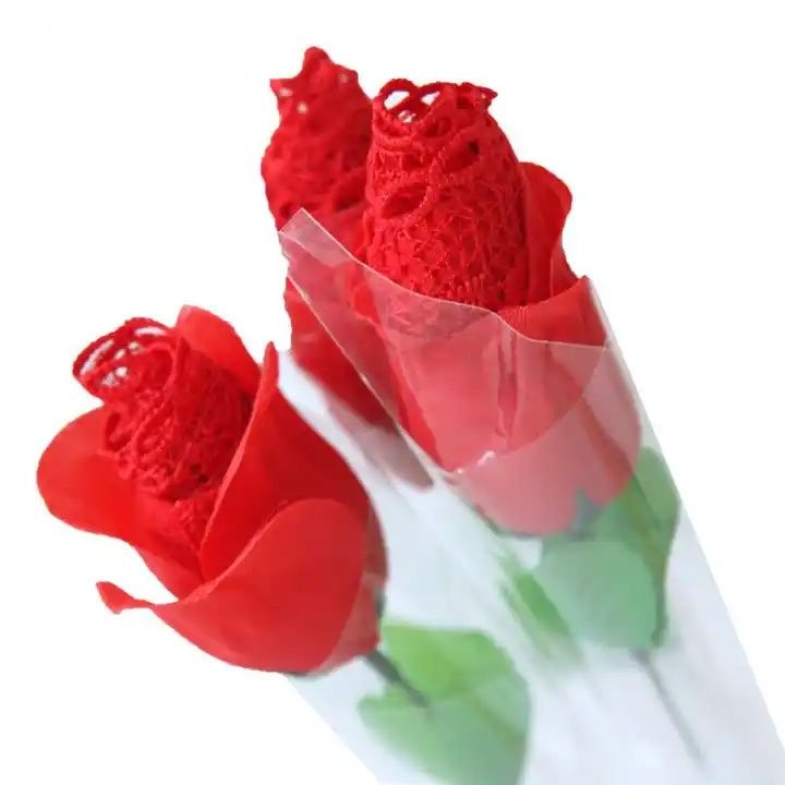 Perizoma rosso in pizzo elasticizzato presentato all’interno di un elegante bocciolo di rosa. Taglia Unica, confortevole e perfetto anche come idea regalo.